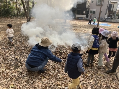 みんなで落ち葉をかけると、もくもくと煙が!!